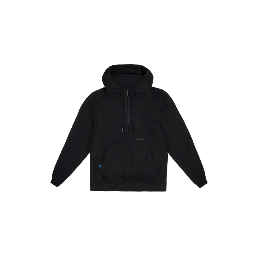 A soft ¼ zip pullover hoodie with a waterproof membrane and fully seam-sealed construction. for relaxed comfort and unexpected waterproof functionality.