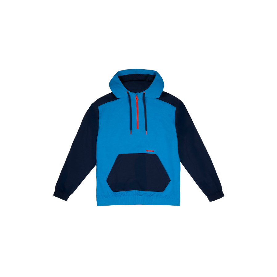 A soft ¼ zip pullover hoodie with a waterproof membrane and fully seam-sealed construction. for relaxed comfort and unexpected waterproof functionality.